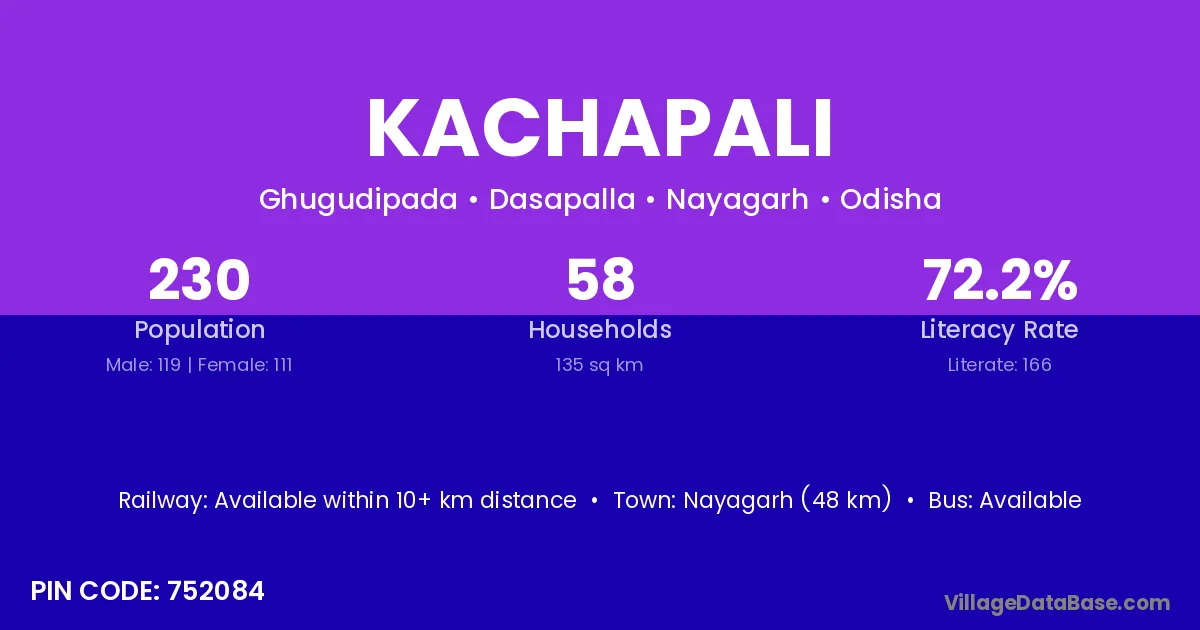 Nayagarh (48 km) is the nearest town to Kachapali village for major economic activities and is located approximately 48 km away.