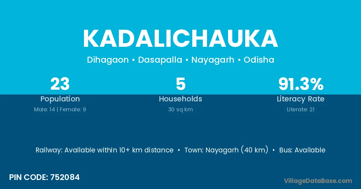 Nayagarh (40 km) is the nearest town to Kadalichauka village for major economic activities and is located approximately 40 km away.