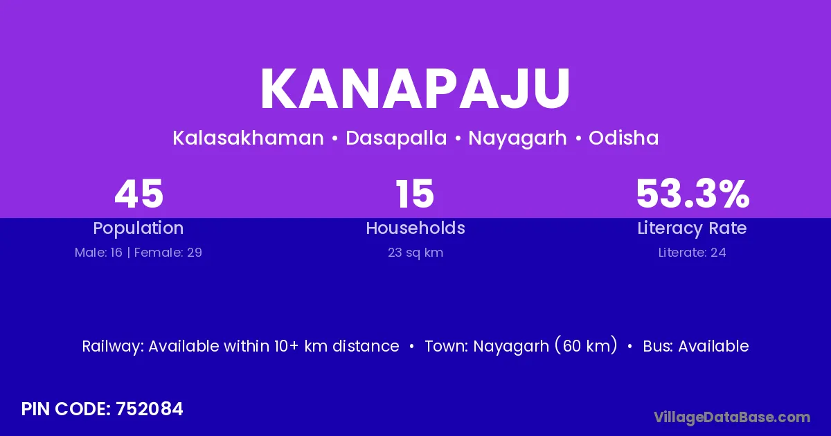 Nayagarh (60 km) is the nearest town to Kanapaju village for major economic activities and is located approximately 60 km away.