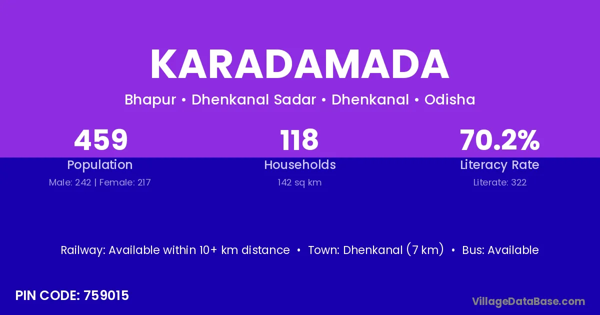 Nayagarh (46 km) is the nearest town to Karadamada village for major economic activities and is located approximately 46 km away.