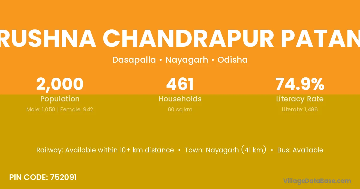 Krushna Chandrapur Patana village has a total population of 2,000 people, of which 1,058 are males and 942 are females.