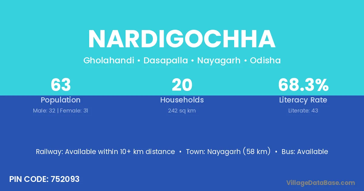 Nayagarh (58 km) is the nearest town to Nardigochha village for major economic activities and is located approximately 58 km away.