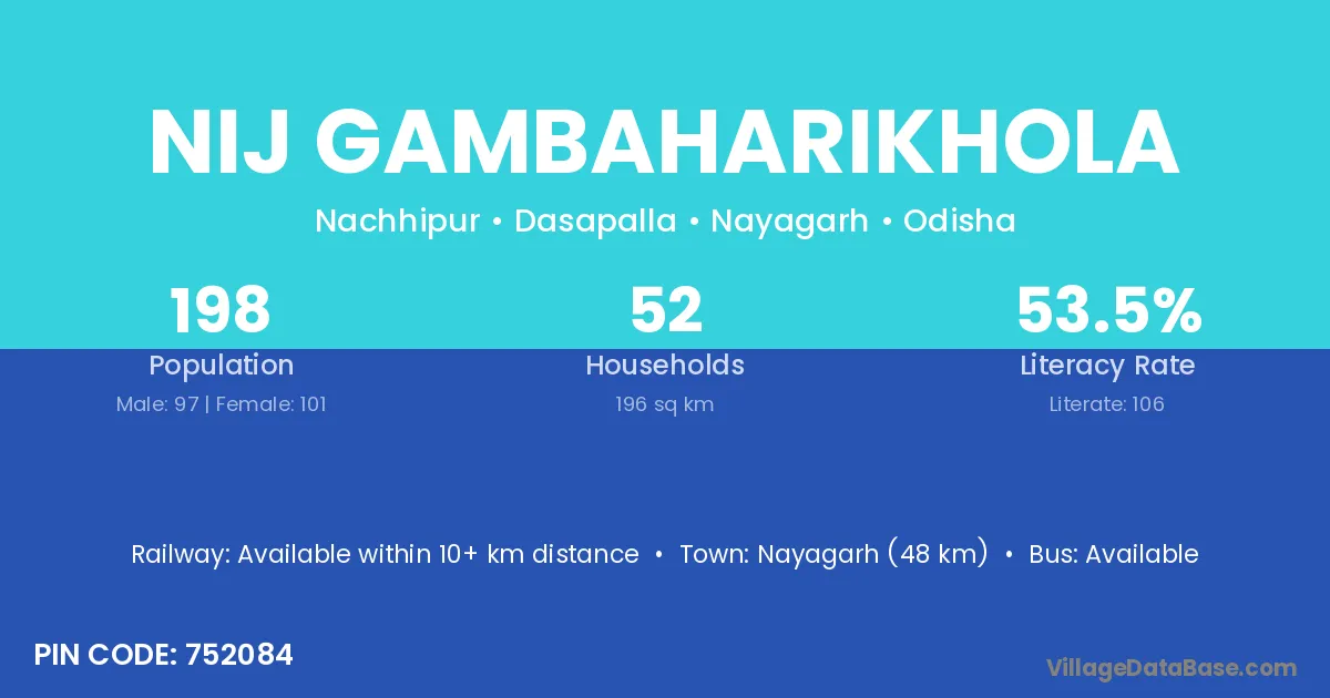 Nayagarh (48 km) is the nearest town to Nij Gambaharikhola village for major economic activities and is located approximately 48 km away.