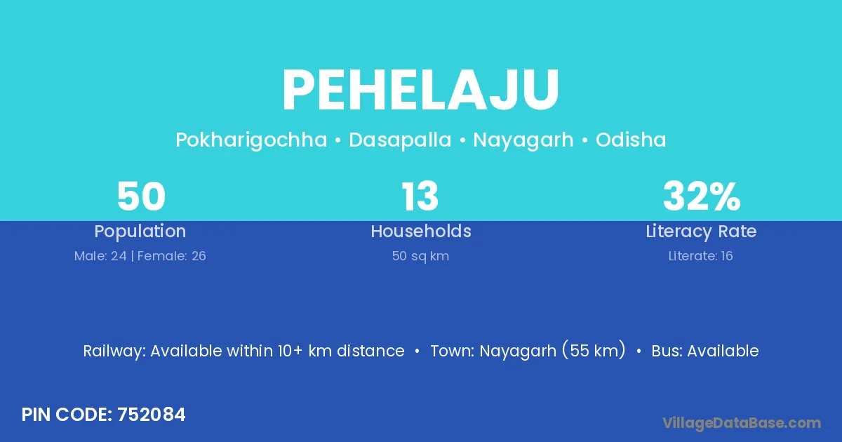 Nayagarh (55 km) is the nearest town to Pehelaju village for major economic activities and is located approximately 55 km away.