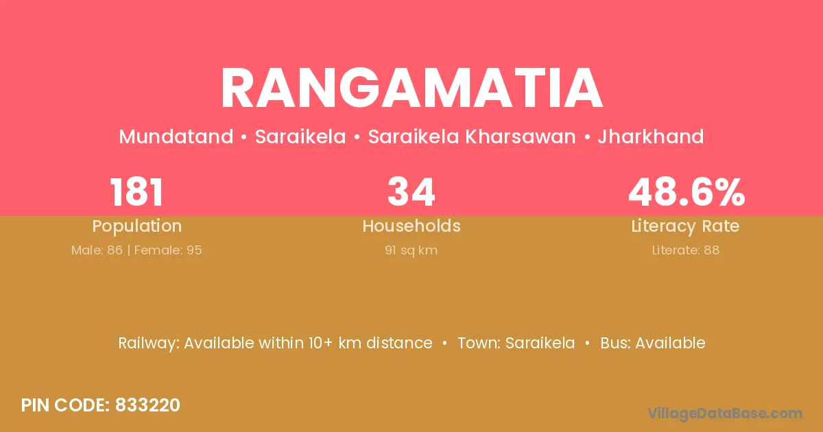 The literacy rate of Rangamatia village is 57.25%. Male literacy stands at 65.15% and female literacy at 49.44%.