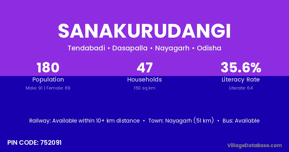 Nayagarh (51 km) is the nearest town to Sanakurudangi village for major economic activities and is located approximately 51 km away.