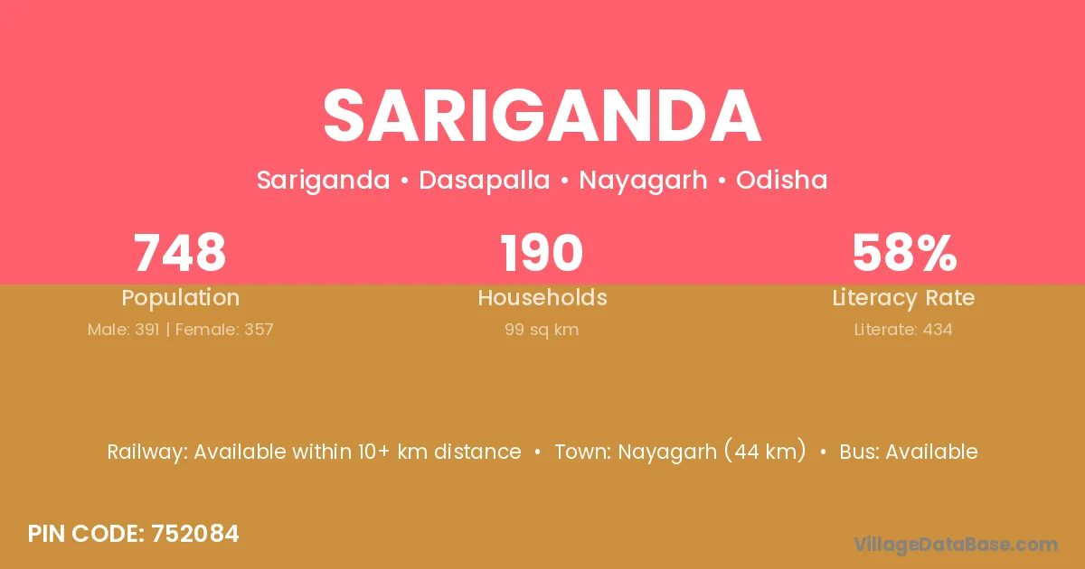 Nayagarh (44 km) is the nearest town to Sariganda village for major economic activities and is located approximately 44 km away.