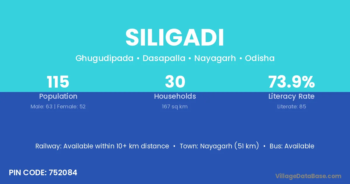 Nayagarh (51 km) is the nearest town to Siligadi village for major economic activities and is located approximately 51 km away.