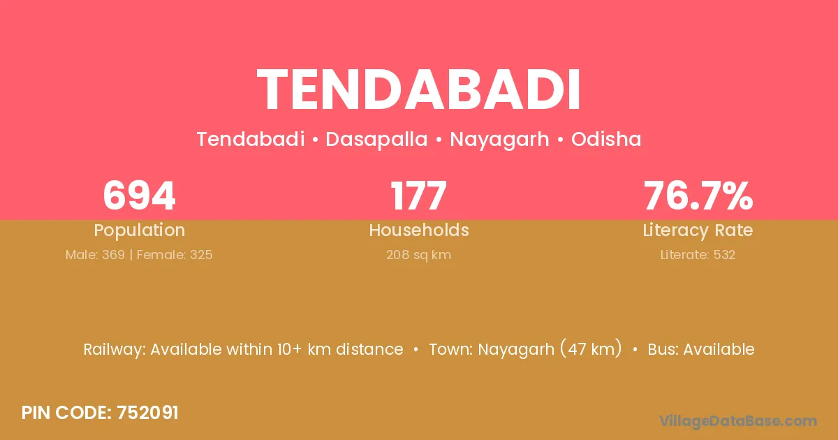 Nayagarh (47 km) is the nearest town to Tendabadi village for major economic activities and is located approximately 47 km away.