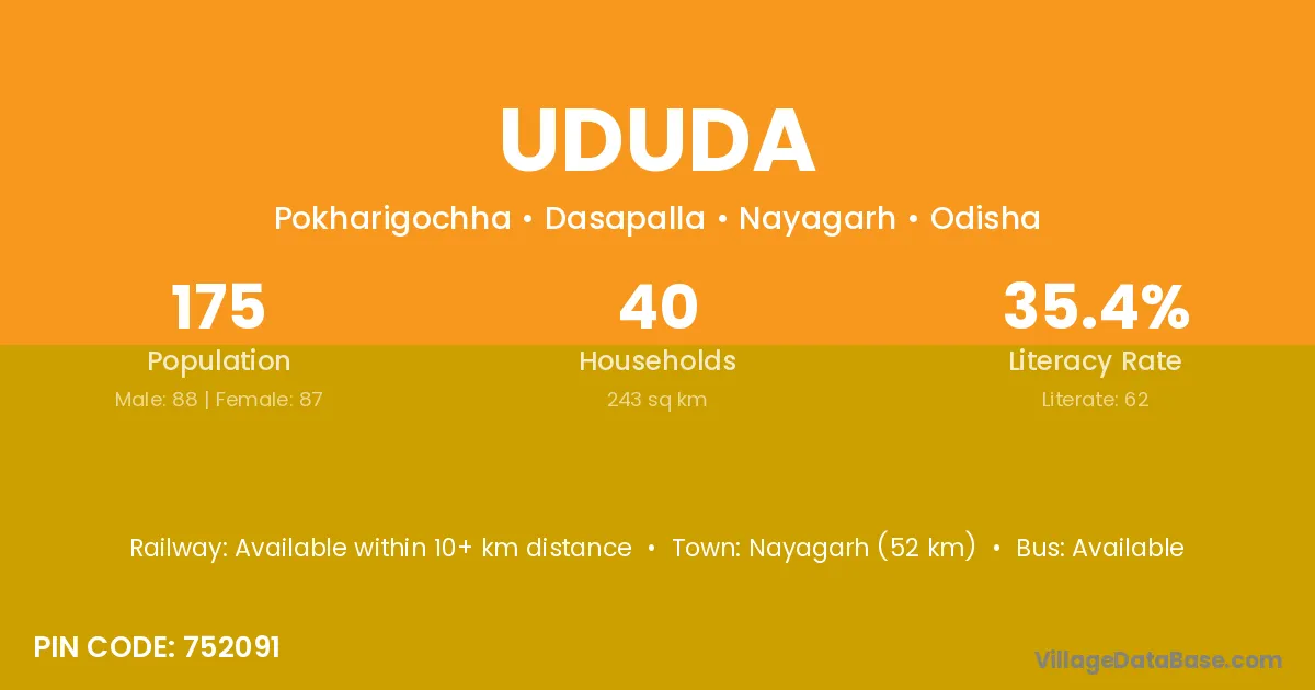 Nayagarh (52 km) is the nearest town to Ududa village for major economic activities and is located approximately 52 km away.