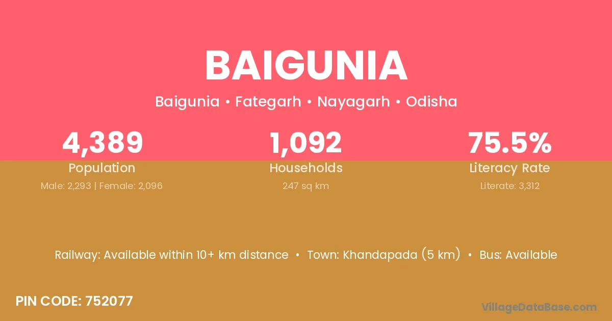 Baigunia village has a total population of 4,389 people, of which 2,293 are males and 2,096 are females.