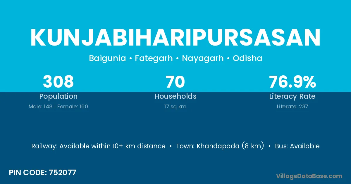 Khandapada (8 km) is the nearest town to Kunjabiharipursasan village for major economic activities and is located approximately 8 km away.