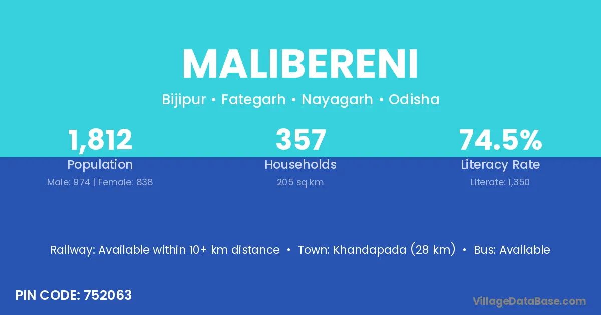 Khandapada (28 km) is the nearest town to Malibereni village for major economic activities and is located approximately 28 km away.