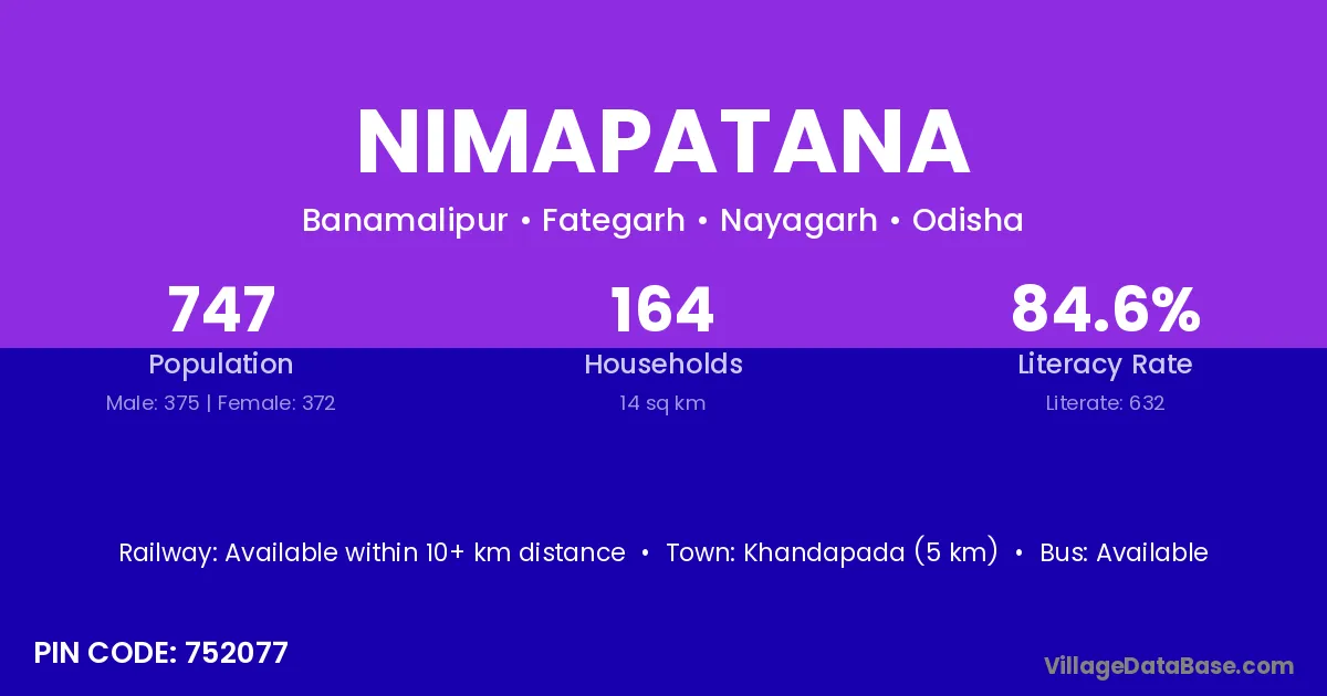Khandapada (5 km) is the nearest town to Nimapatana village for major economic activities and is located approximately 5 km away.