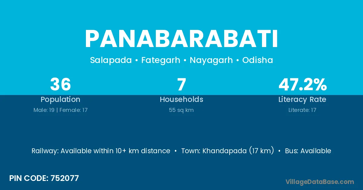 Khandapada (17 km) is the nearest town to Panabarabati village for major economic activities and is located approximately 17 km away.