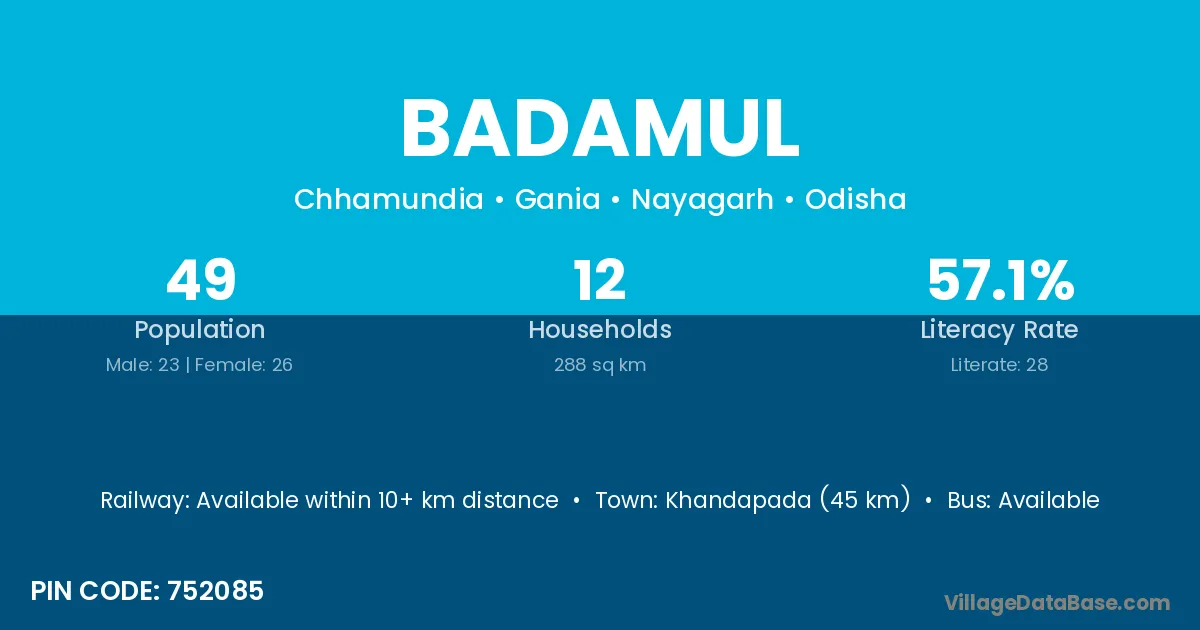 Khandapada (45 km) is the nearest town to Badamul village for major economic activities and is located approximately 45 km away.