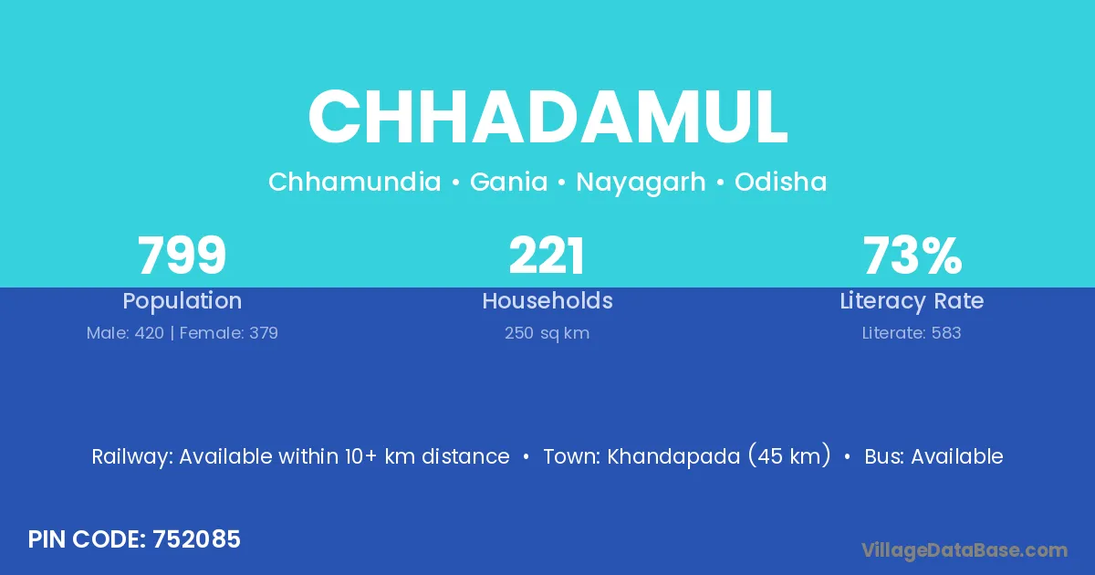 Khandapada (45 km) is the nearest town to Chhadamul village for major economic activities and is located approximately 45 km away.