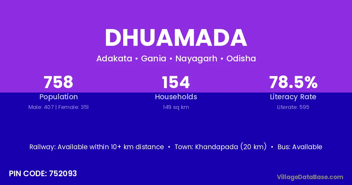 Khandapada (20 km) is the nearest town to Dhuamada village for major economic activities and is located approximately 20 km away.