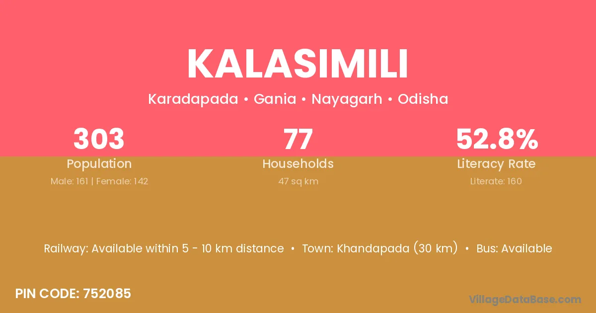 Khandapada (30 km) is the nearest town to Kalasimili village for major economic activities and is located approximately 30 km away.