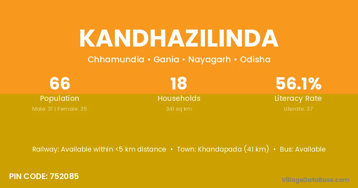 Khandapada (41 km) is the nearest town to Kandhazilinda village for major economic activities and is located approximately 41 km away.