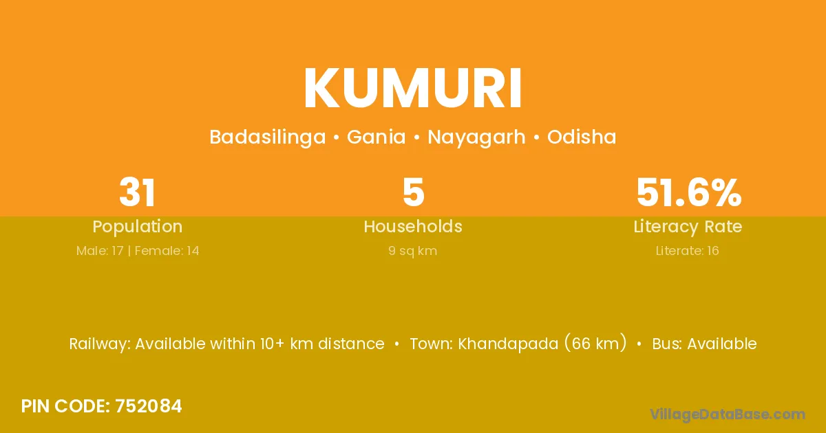 Khandapada (66 km) is the nearest town to Kumuri village for major economic activities and is located approximately 66 km away.