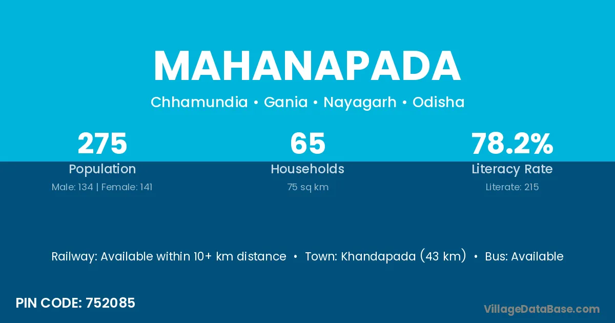 Khandapada (43 km) is the nearest town to Mahanapada village for major economic activities and is located approximately 43 km away.