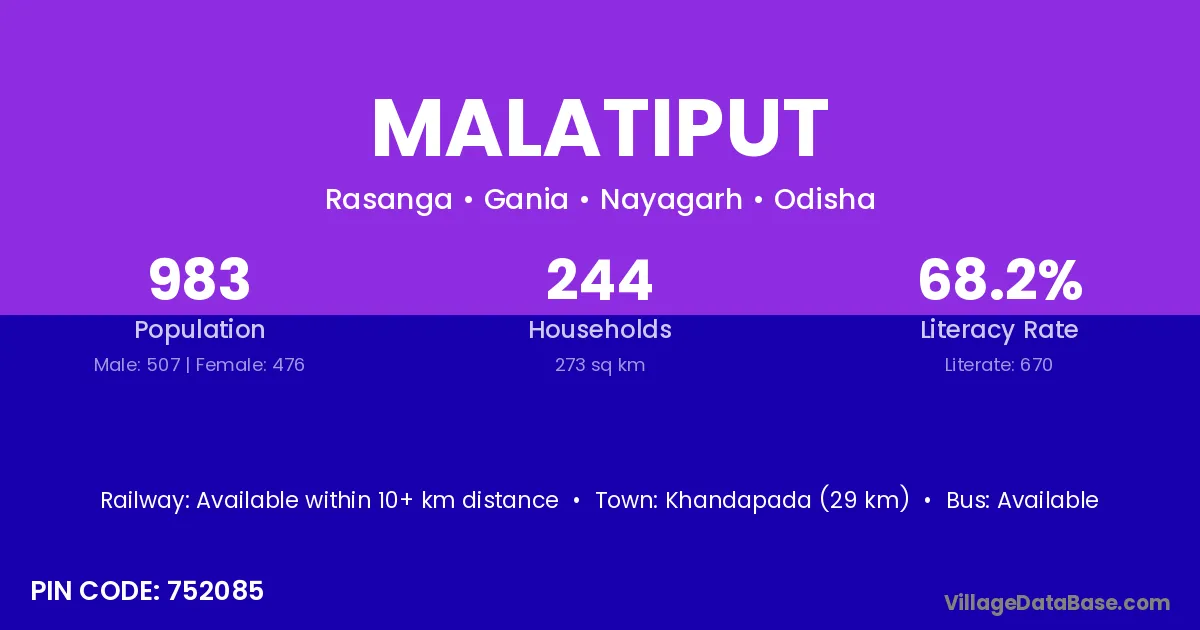 Khandapada (29 km) is the nearest town to Malatiput village for major economic activities and is located approximately 29 km away.