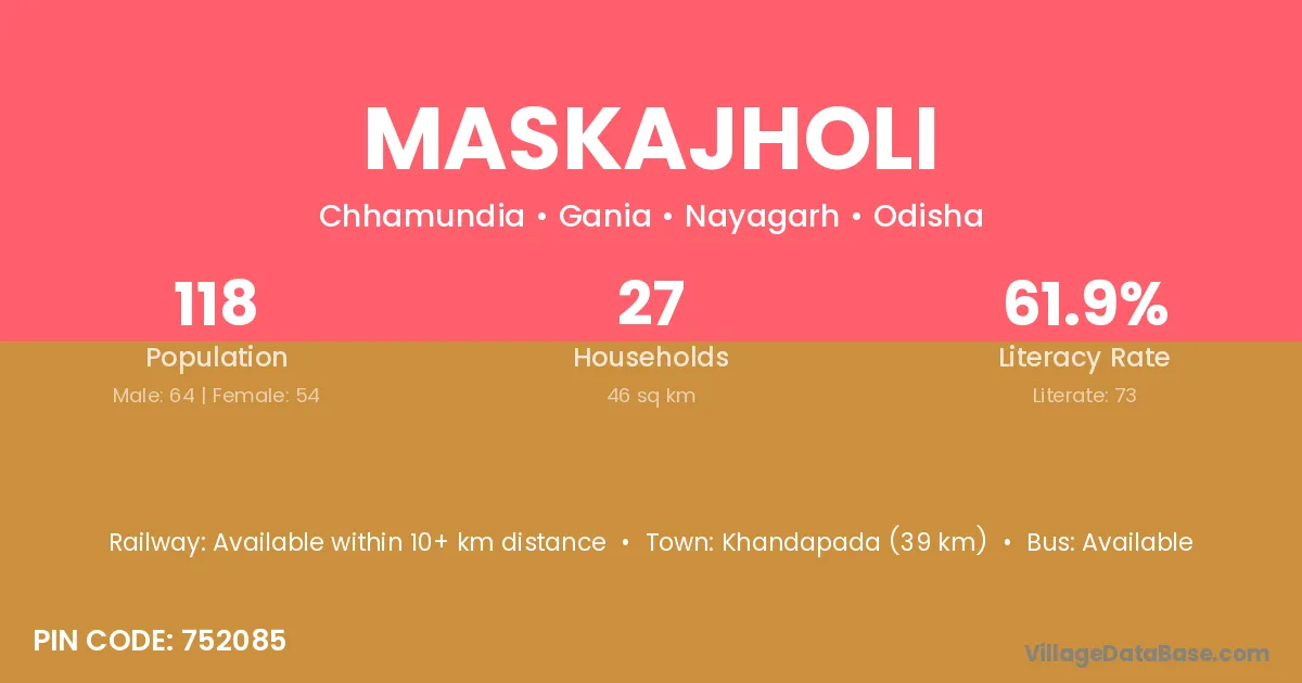 Khandapada (39 km) is the nearest town to Maskajholi village for major economic activities and is located approximately 39 km away.
