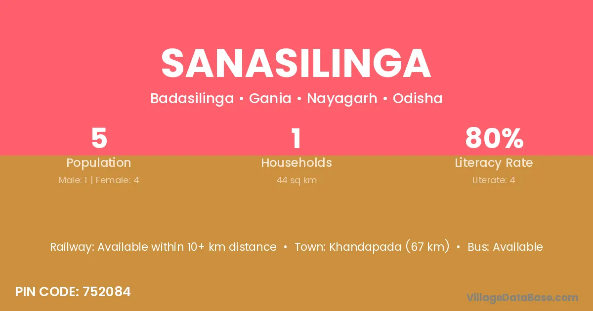 Sanasilinga village has a total population of 5 people, of which 1 are males and 4 are females.