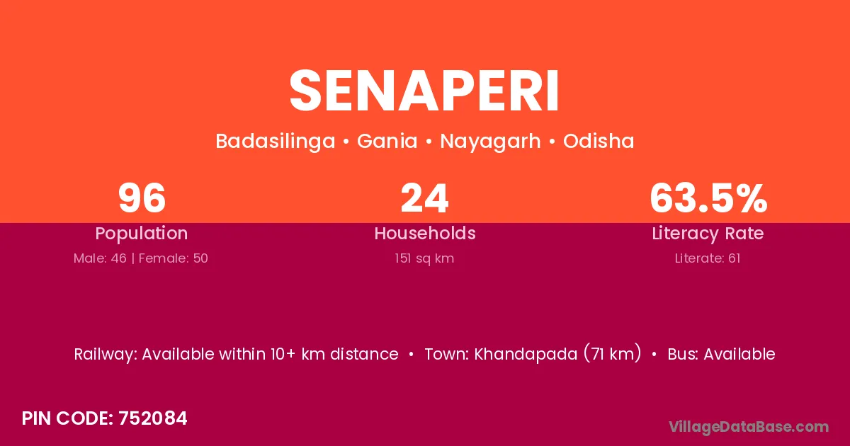 Khandapada (71 km) is the nearest town to Senaperi village for major economic activities and is located approximately 71 km away.