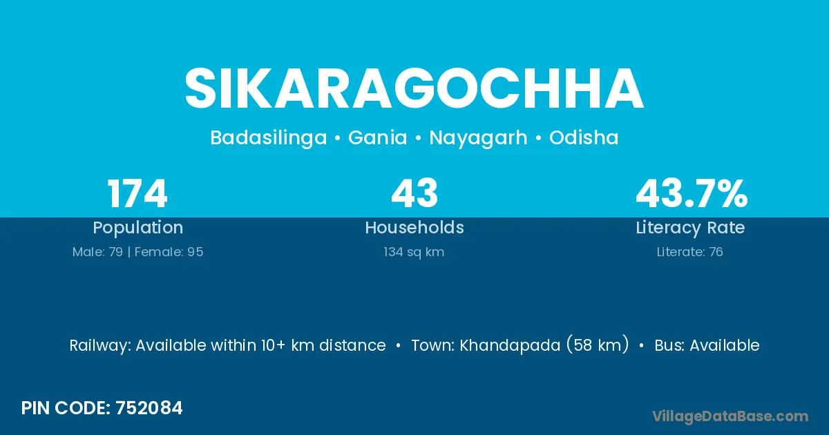 Khandapada (58 km) is the nearest town to Sikaragochha village for major economic activities and is located approximately 58 km away.