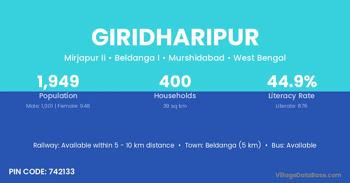 Khandapada (5 km) is the nearest town to Giridharipur village for major economic activities and is located approximately 5 km away.