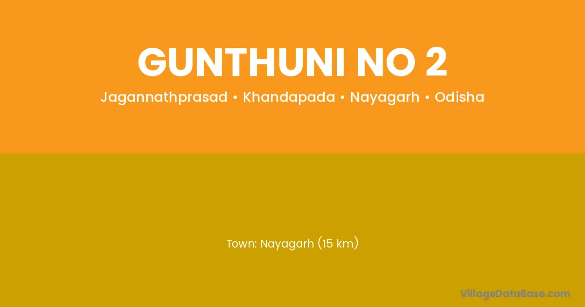 Nayagarh (15 km) is the nearest town to Gunthuni No 2 village for major economic activities and is located approximately 15 km away.