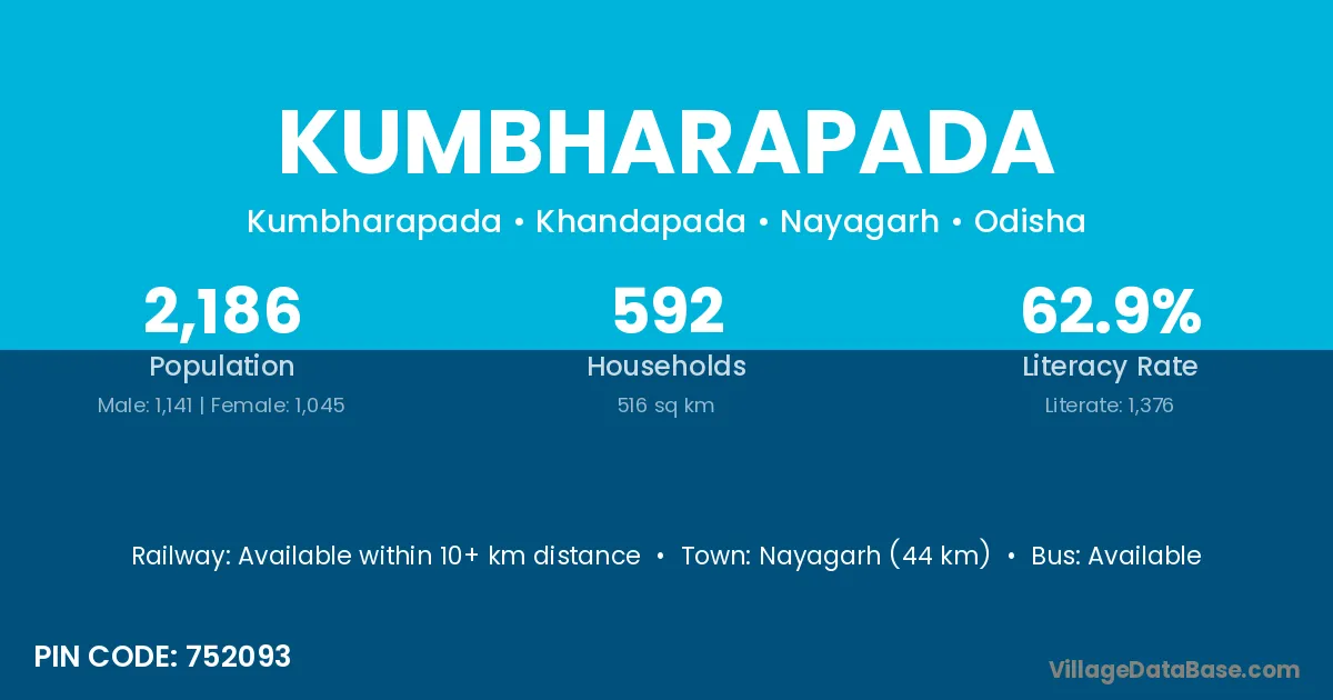 Nayagarh (44 km) is the nearest town to Kumbharapada village for major economic activities and is located approximately 44 km away.