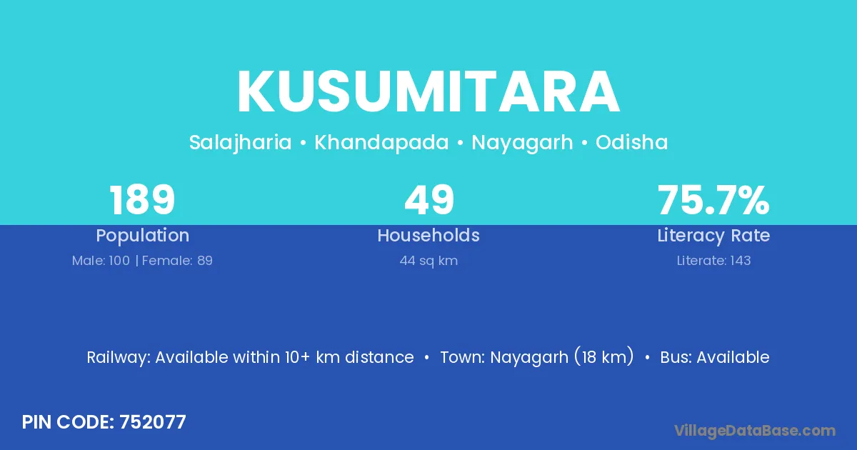 Nayagarh (18 km) is the nearest town to Kusumitara village for major economic activities and is located approximately 18 km away.