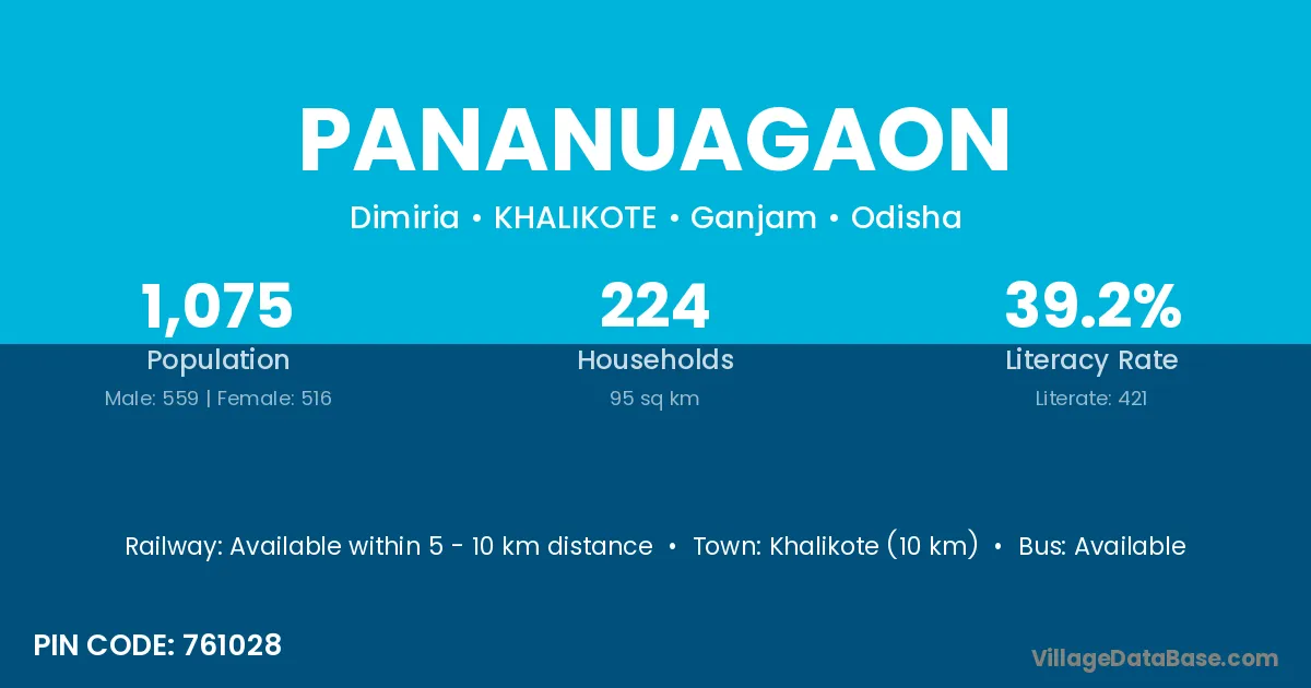 Nayagarh (30 km) is the nearest town to Pananuagaon village for major economic activities and is located approximately 30 km away.
