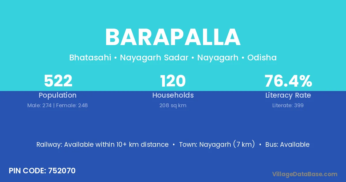 Nayagarh (7 km) is the nearest town to Barapalla village for major economic activities and is located approximately 7 km away.