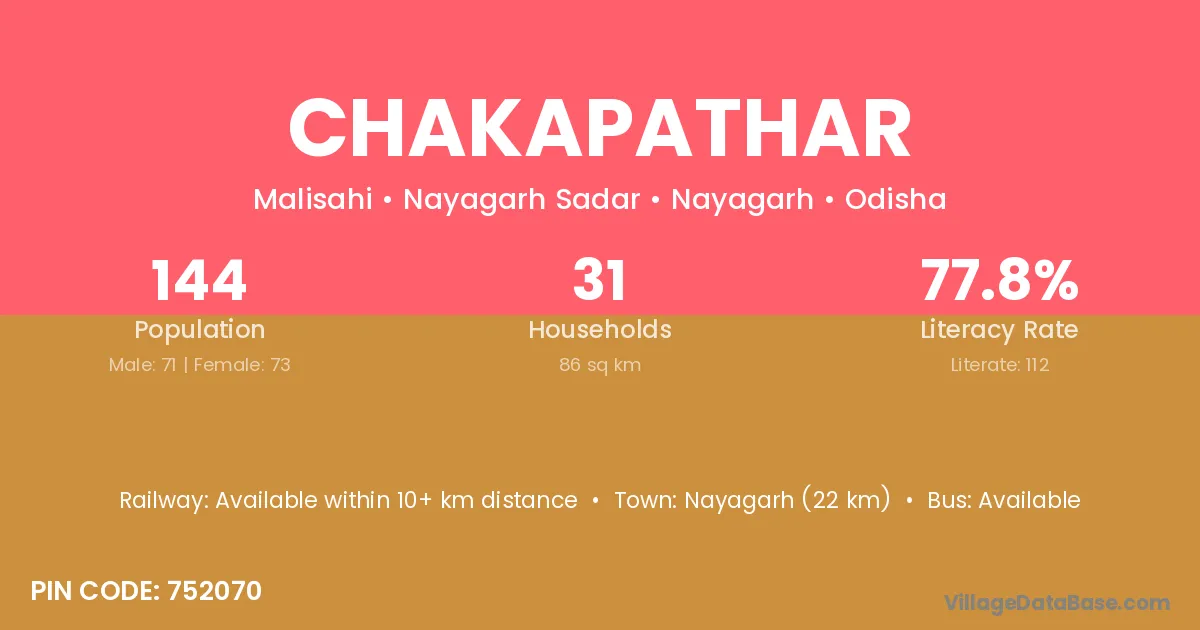 Nayagarh (22 km) is the nearest town to Chakapathar village for major economic activities and is located approximately 22 km away.