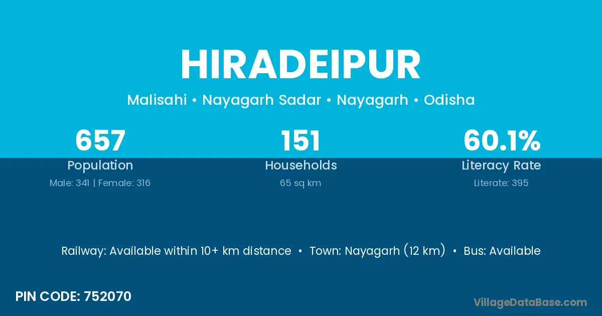 Nayagarh (12 km) is the nearest town to Hiradeipur village for major economic activities and is located approximately 12 km away.