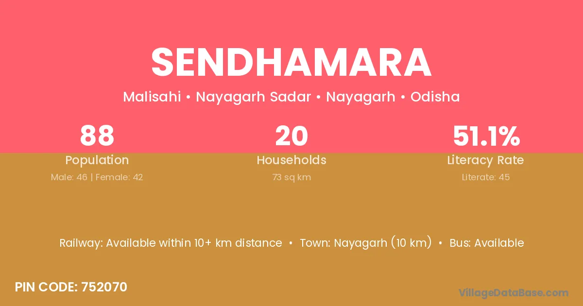 Nayagarh (10 km) is the nearest town to Sendhamara village for major economic activities and is located approximately 10 km away.