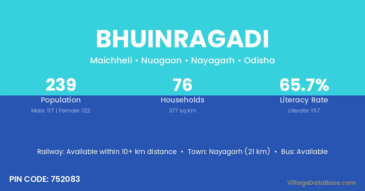 Nayagarh (21 km) is the nearest town to Bhuinragadi village for major economic activities and is located approximately 21 km away.