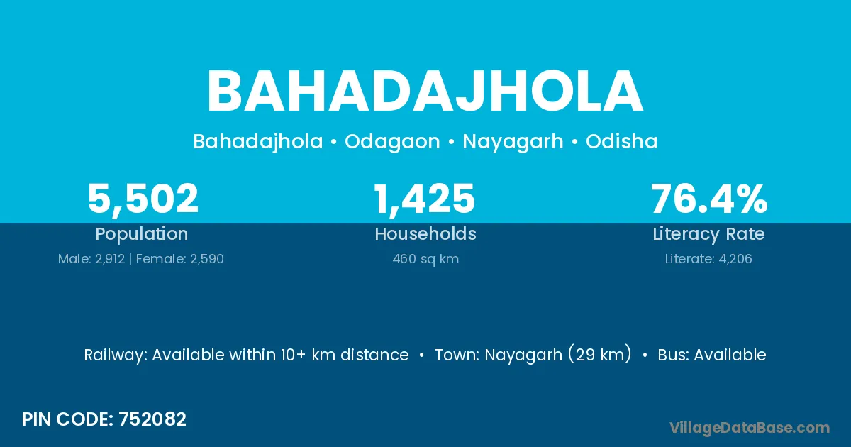 Nayagarh (29 km) is the nearest town to Bahadajhola village for major economic activities and is located approximately 29 km away.
