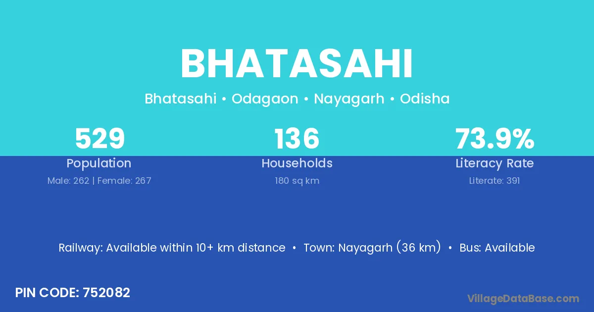Nayagarh (36 km) is the nearest town to Bhatasahi village for major economic activities and is located approximately 36 km away.