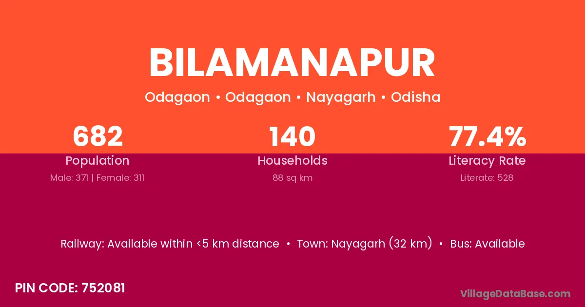 Nayagarh (32 km) is the nearest town to Bilamanapur village for major economic activities and is located approximately 32 km away.