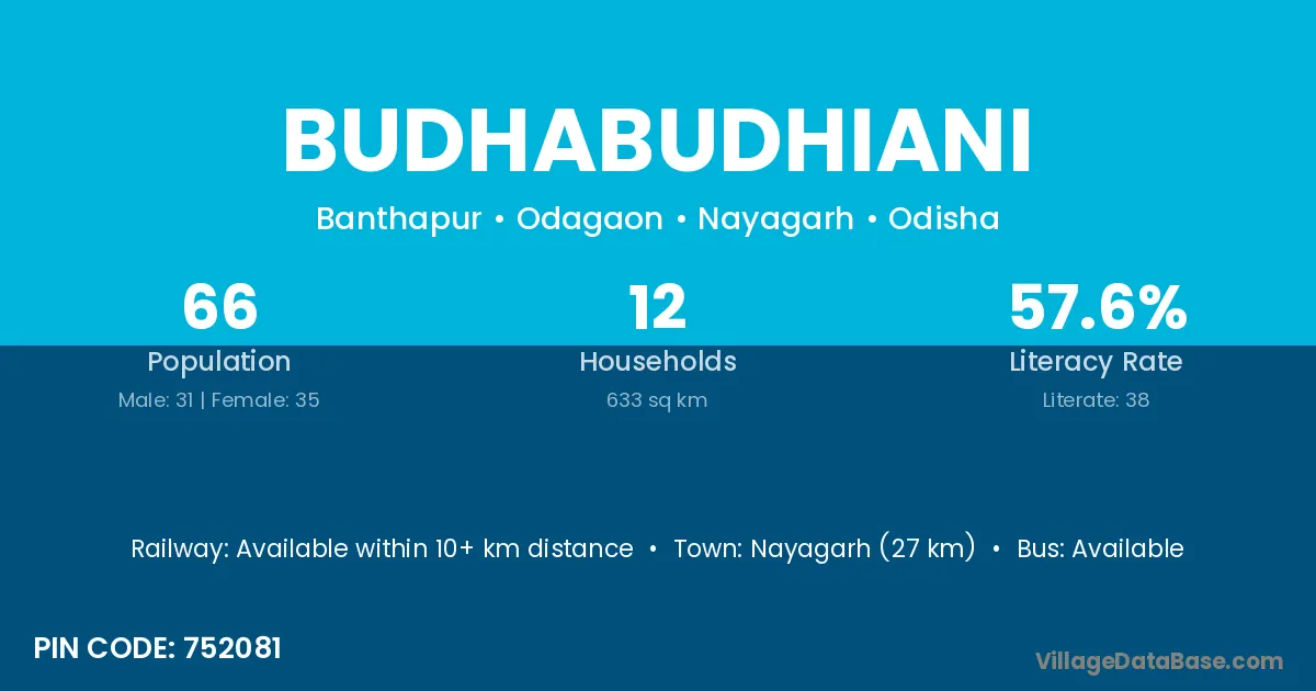 Nayagarh (27 km) is the nearest town to Budhabudhiani village for major economic activities and is located approximately 27 km away.