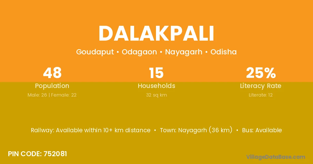 Nayagarh (36 km) is the nearest town to Dalakpali village for major economic activities and is located approximately 36 km away.