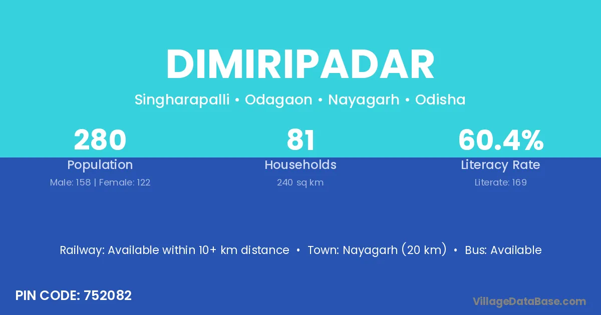 Nayagarh (20 km) is the nearest town to Dimiripadar village for major economic activities and is located approximately 20 km away.