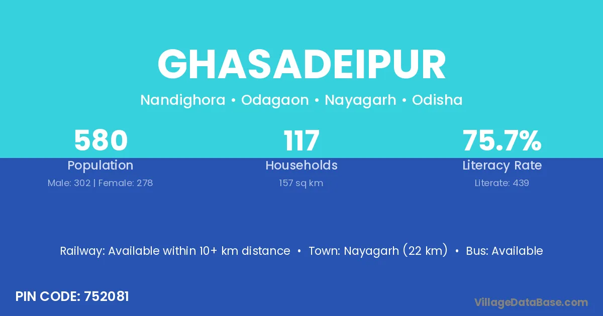 Nayagarh (22 km) is the nearest town to Ghasadeipur village for major economic activities and is located approximately 22 km away.