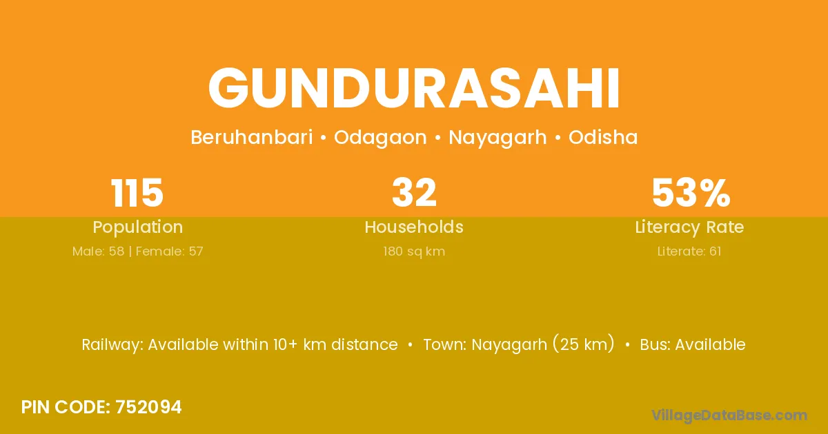 Nayagarh (25 km) is the nearest town to Gundurasahi village for major economic activities and is located approximately 25 km away.