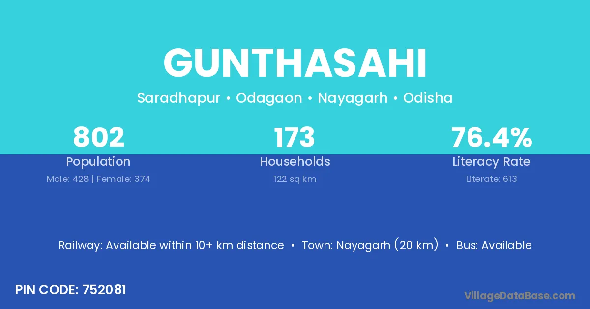 Nayagarh (20 km) is the nearest town to Gunthasahi village for major economic activities and is located approximately 20 km away.